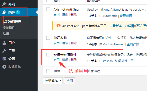 (3).切換到后臺界面,選擇:插件 > 短信寶短信插件 > 啟用。如下: