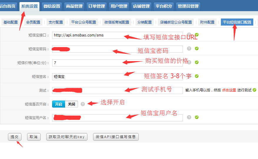 四:進(jìn)入系統(tǒng)設(shè)置->站點(diǎn)配置->平臺(tái)短信接口配置 填寫相關(guān)短信配置信息,填寫完成保存配置即可。
