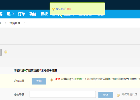 五.點擊短信管理,填寫您的手機號碼進行測試,提示發(fā)送成功說明您的短信插件安裝成功