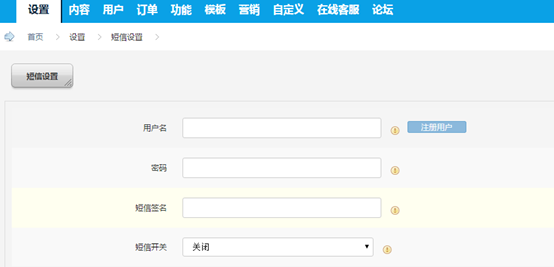四.點擊左側(cè)導航欄,短信設(shè)置,并填寫您的短信寶配置信息