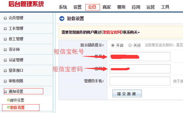 三:進(jìn)入系統(tǒng)管理后臺(tái)->會(huì)員->通知設(shè)置->短信設(shè)置 填寫(xiě)相關(guān)短信配置信息,填寫(xiě)完成保存配置即可。
