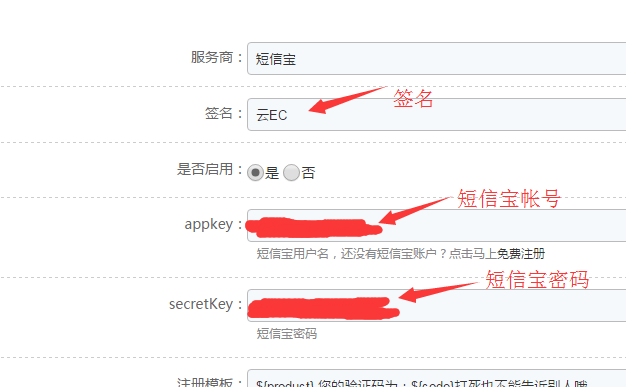 填寫短信寶的用戶名、密碼與短信簽名,簽名為中英文組合的3-8個字符,填寫后點擊保存。