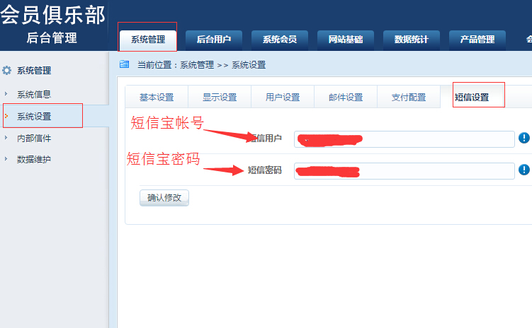 三:進入管理后臺->系統管理->系統設置->短信設置,填寫短信寶的賬號密碼信息保存。短信的簽名為網站名稱(系統設置->基本設置->網站名稱),請根據需要修改,簽名請勿填寫特殊字符。