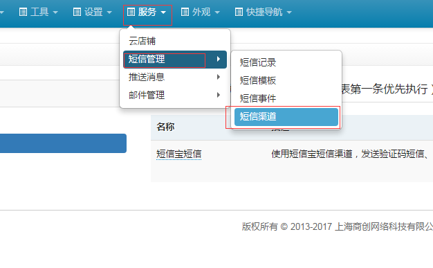 三:在服務(wù)->短信管理->短信渠道,選擇短信寶,點(diǎn)擊編輯,填寫(xiě)你的短信寶用戶(hù)名,密碼以及短信的簽名信息并保存。
