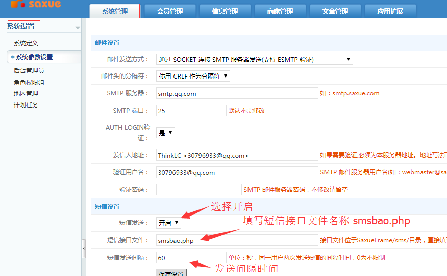 二:進入系統管理后臺->系統管理->系統設置->系統參數設置 填寫完成保存配置即可。