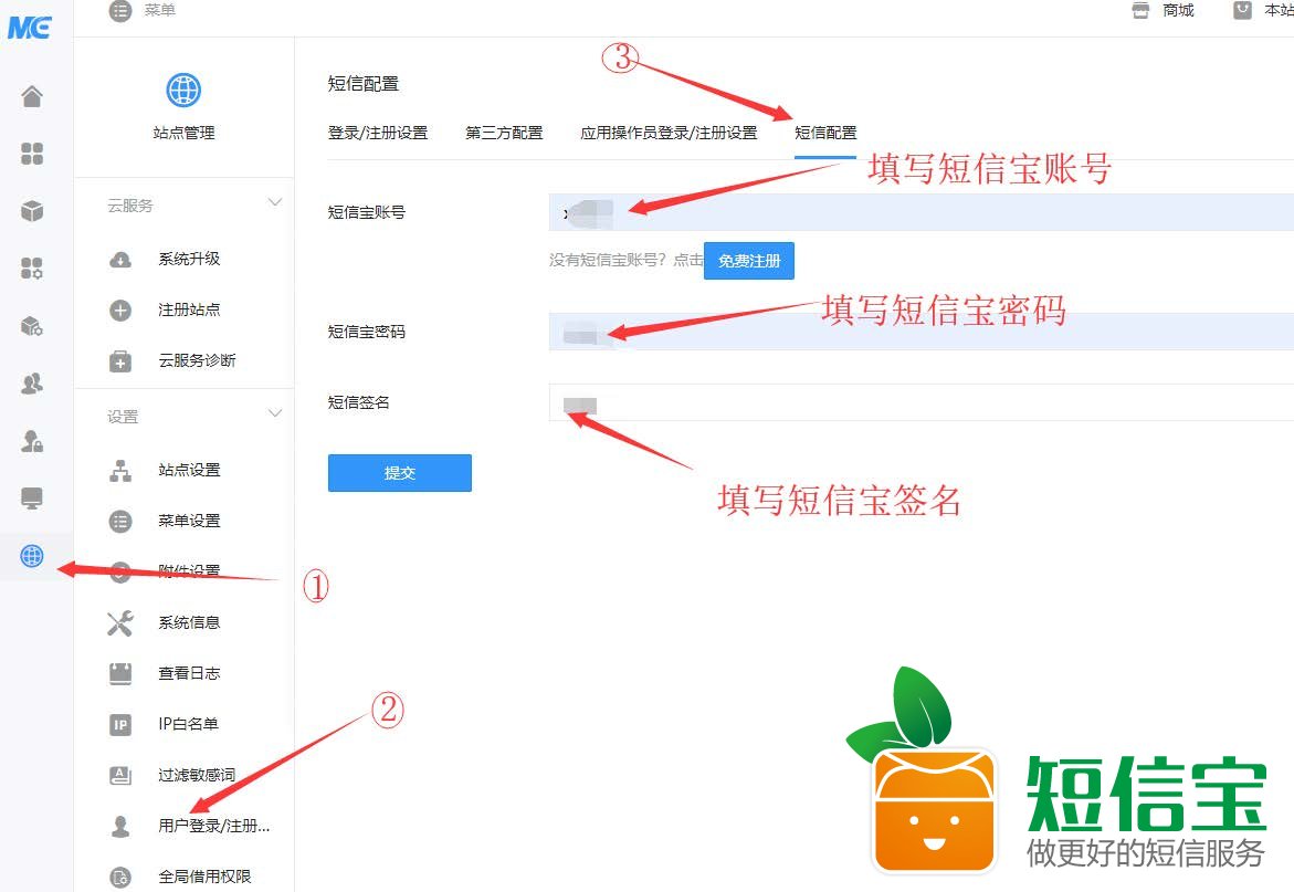 三:進入系統管理后臺->站點設置->用戶登錄/注冊設置->短信配置 填寫相關短信配置信息,填寫完成保存配置即可。