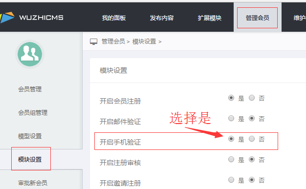 四:開啟手機注冊:進入后臺->管理會員-》模塊設置,開啟手機驗證。