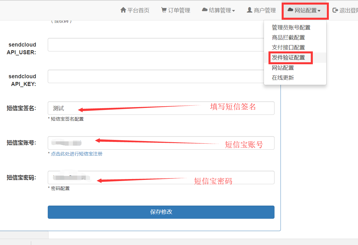 4:配置短信寶信息:進入系統->網站配置->發件驗證配置, 分別填寫您的短信寶賬號,密碼與短信的簽名,簽名一般為3-8個字符,點擊保存提交。