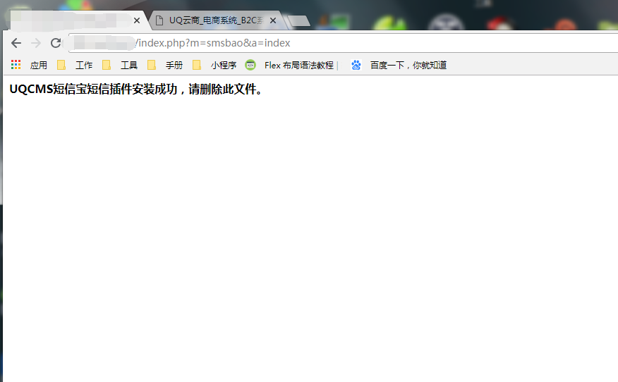 3:輸入你的域名/index.php?m=smsbao&a=index,進行安裝短信寶插件,看到EUQCMS短信寶插件安裝成功,請刪除smsbao.class.php 即為插件安裝成功,插件安裝失敗請聯系短信寶在線客服。