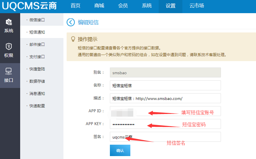 4:進入后臺->設置->接口->短信通知,選擇短信寶。