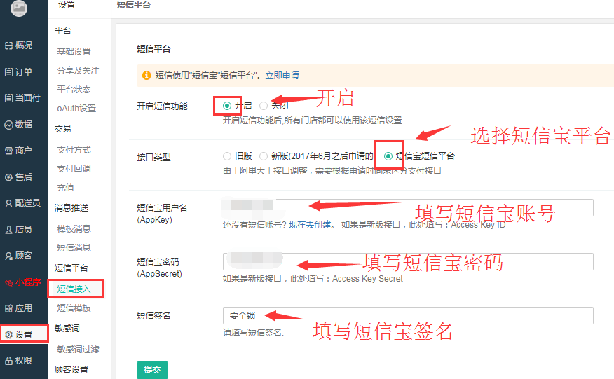 2:進(jìn)入系統(tǒng)后臺-》設(shè)置-》-》短信平臺-》短信接入,填寫短信參數(shù)