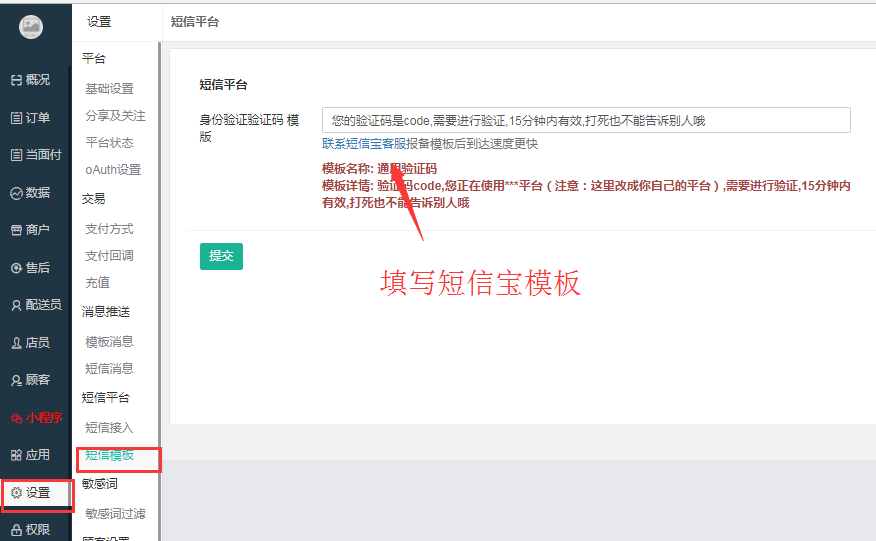 3: 進(jìn)入系統(tǒng)后臺-》設(shè)置-》短信平臺-》短信模版,填寫短信模版內(nèi)容。
