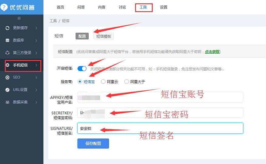 3:進入后臺->工具->手機短信,填寫短信寶相關配置,保存即可。