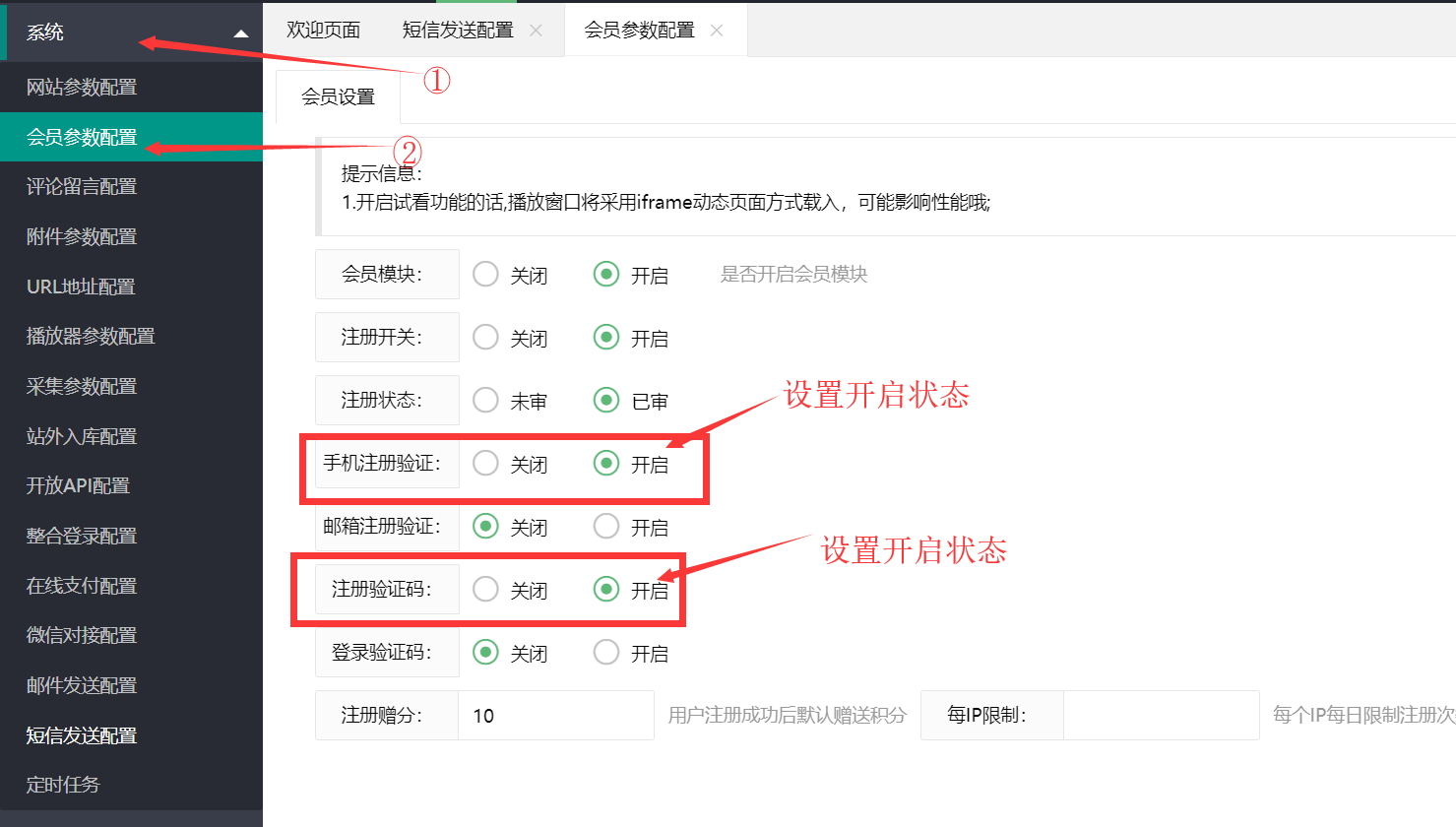 4:進入系統(tǒng)管理后臺->系統(tǒng)->會員參數(shù)配置 手機注冊驗證設(shè)為開啟,注冊驗證碼設(shè)為開啟。