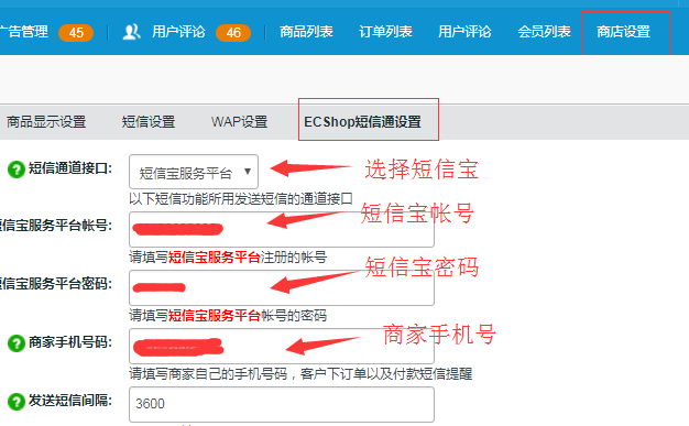 四:進入系統管理后臺->商店設置->Ecshop短信通設置, 填寫相關短信配置信息,填寫完成保存配置即可。