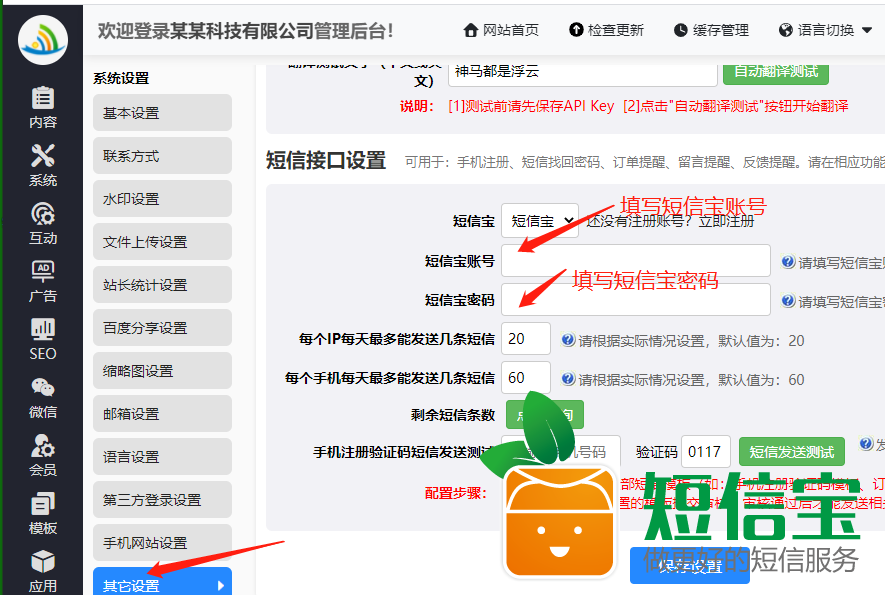 3:進入管理后臺-》設置-》其他設置-》短信接口設置,填寫你的短信寶賬號、密碼