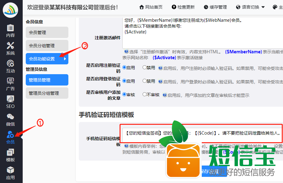 4: 進入管理后臺->會員->會員功能設置->手機驗證碼短信模板,設置短信模板