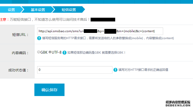 1.短信URL填: http://api.smsbao.com/sms?u=短信寶用戶名&p=md5加密后密碼&m={mobile}&c={content}