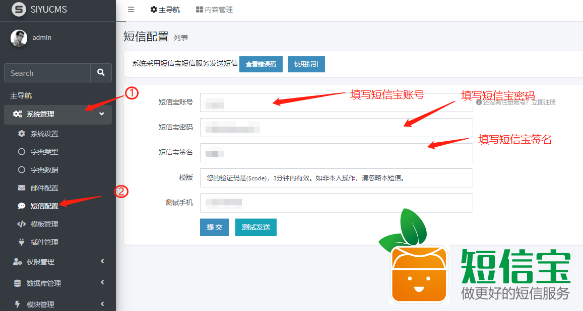 2:選擇: 系統管理-》短信配置中,填寫你的短信寶賬號、密碼、短信簽名以及模板完成后保存設置即可。
