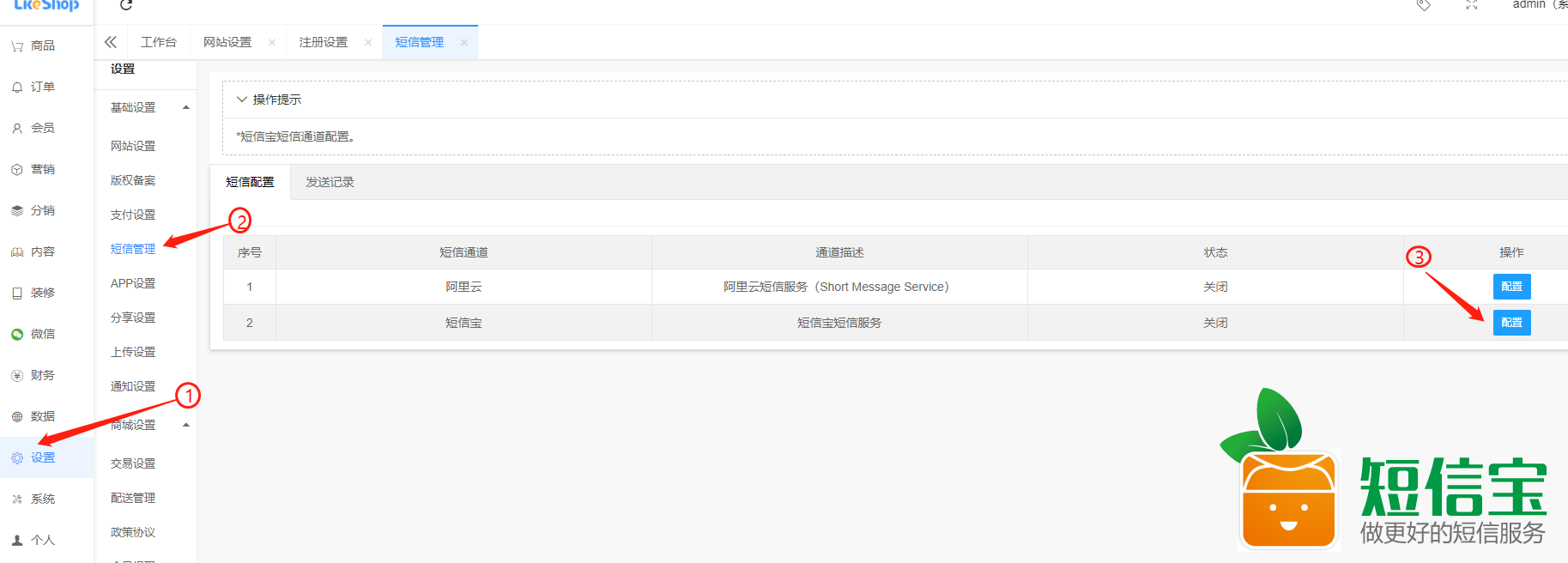 2:進入管理后臺-》設置-》短信管理-》短信配置,選擇短信寶并填寫你的短信寶賬號、密碼。