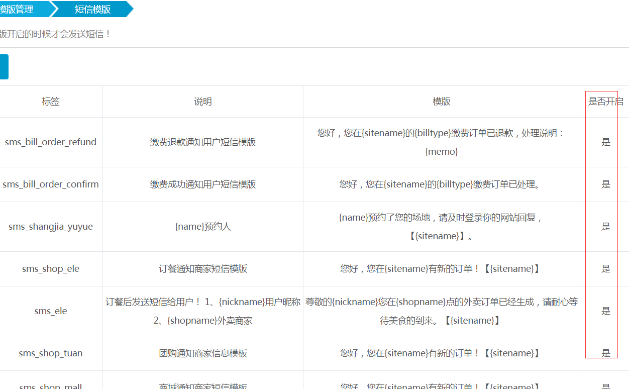 當你的URL填寫正確無誤但是還是不能發送成功,那么我們就需要查看一下是不是模版沒有開啟,模版的位置在后臺->設置->模版管理->短信模版, 如下圖: