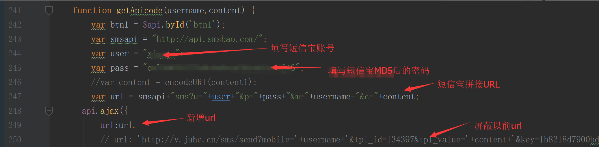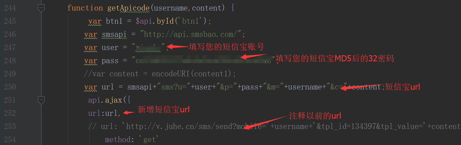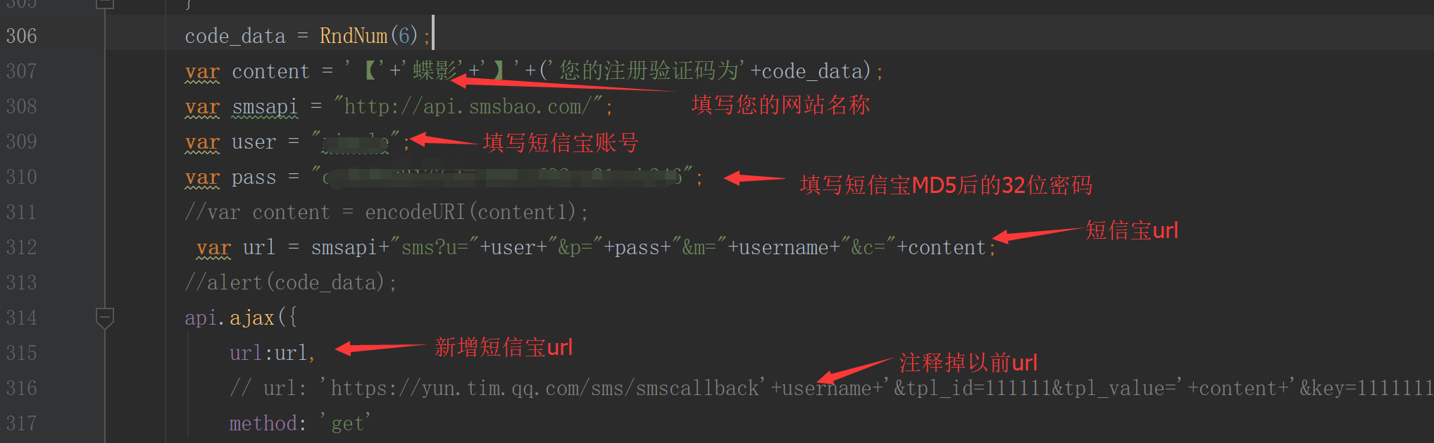 打開項目:APPCode\html\reg_frm.html 在306行代碼左右添加短信寶接口代碼(項目中所有短信寶密碼都是MD5加密后32位)